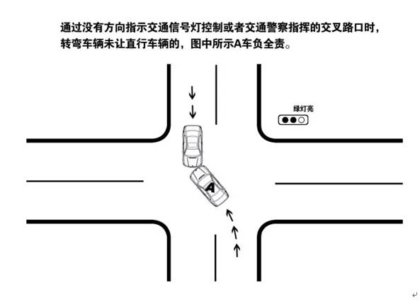 3.通过没有方向指示交通信号灯控制或者交通警察指挥的交叉路口时,转弯车辆未让直行车辆的,转弯车负全责。