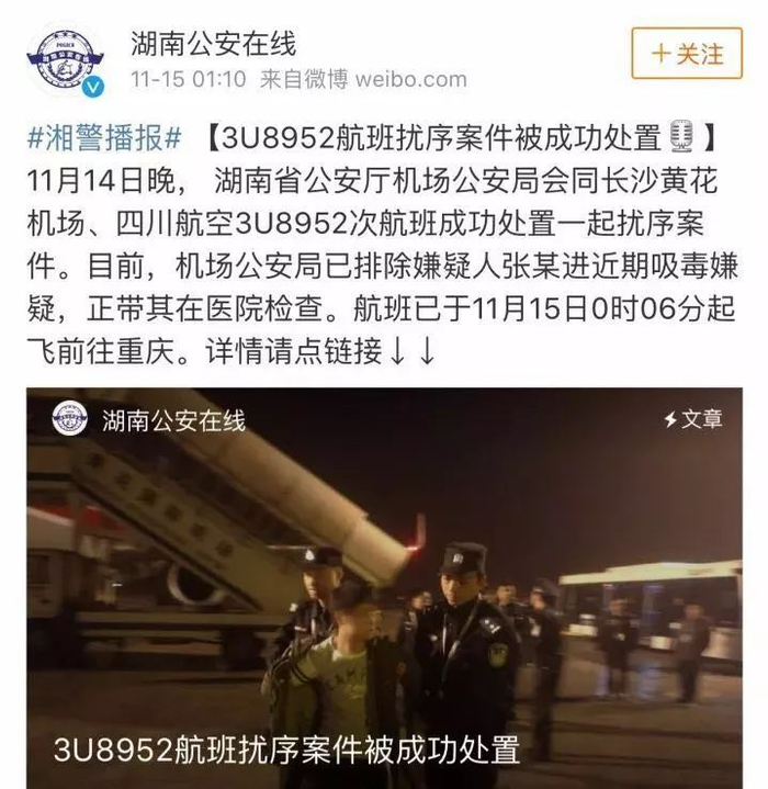 ▶昨日,针对网络流传的“吸毒人员劫持厦门至长沙一航班”的消息,当地警方回应,并非劫机,是一起扰序案件,已排除嫌疑人张某近期吸毒嫌疑。