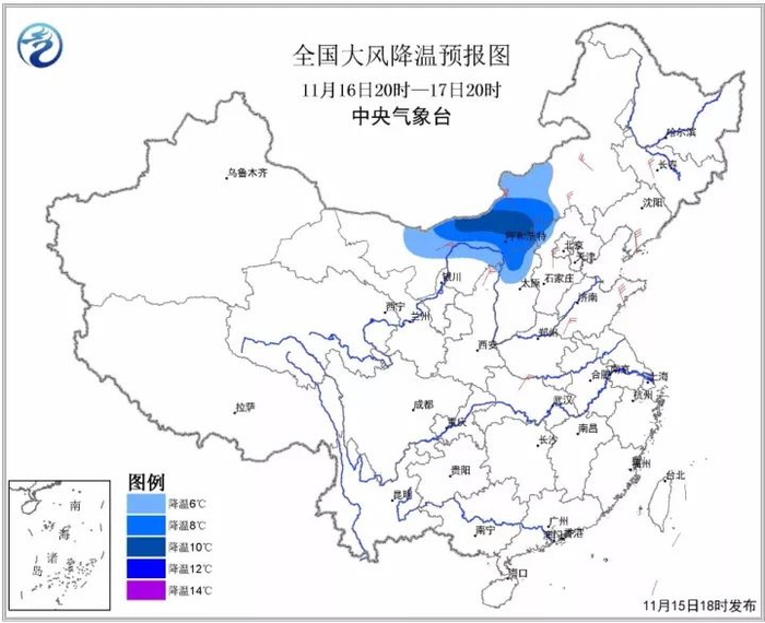 ▶中央气象台昨日发布寒潮蓝色预警,预计16日至17日内蒙古中西部、山西北部、河北西北部等地最低气温或平均气温将下降6~8℃,其中内蒙古中西部的部分地区降温幅度可达10~12℃。