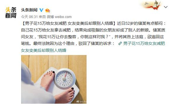 【男子花15万给女友减肥 女友变美后却跟别人结婚】近日52岁的储某有点郁闷:自己花15万给女友拿去减肥,结果完成吸脂的女朋友却成了别人的新娘。储某质问女友,“我花15万让你去整容,你就这样对我?”,并将其告上法庭,欲追回这笔钱。最终法院驳回了储某的诉讼请求,因为储某无法证明这15万元款项以结婚为目的,因此属于消费性馈赠,不须返还。
