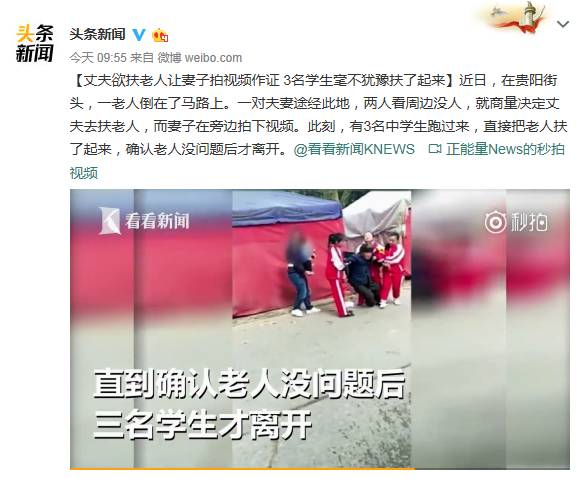 【丈夫欲扶老人让妻子拍视频作证 3名学生毫不犹豫扶了起来】近日,在贵阳街头,一老人倒在了马路上。一对夫妻途经此地,两人看周边没人,就商量决定丈夫去扶老人,而妻子在旁边拍下视频。此刻,有3名中学生跑过来,直接把老人扶了起来,确认老人没问题后才离开。
