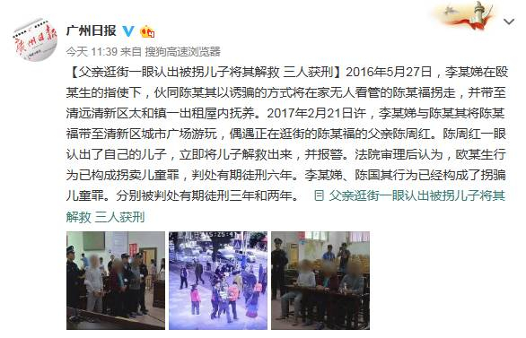 【父亲逛街一眼认出被拐儿子将其解救 三人获刑】2016年5月27日,李某娣在欧某生的指使下,伙同陈某其以诱骗的方式将在家无人看管的陈某福拐走,并带至清远清新区太和镇一出租屋内抚养。2017年2月21日许,李某娣与陈某其将陈某福带至清新区城市广场游玩,偶遇正在逛街的陈某福的父亲陈周红。陈周红一眼认出了自己的儿子,立即将儿子解救出来,并报警。法院审理后认为,欧某生行为已构成拐卖儿童罪,判处有期徒刑六年。李某娣、陈某其行为已经构成了拐骗儿童罪。分别被判处有期徒刑三年和两年。