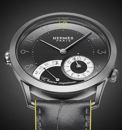 本届Only Watch的主题色是黄色,很多品牌遵守了,比如爱马仕的这款时间守候腕表,12点时标和表带都改成了黄色。