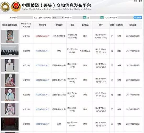 目前,公安机关和文物部门搜集了2000余条被盗、丢失文物信息数据,已在平台发布200余条,更多被盗、丢失文物信息将分期分批发布。