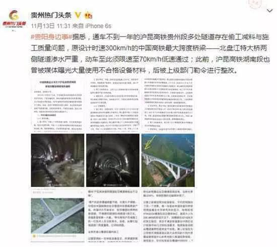 13日上午,微博名为“贵州热门头条”的网友发布微博所附红头文件的图片显示,2017年6月底至7月初,沪昆高铁贵州段连续发生多起危及行车安全,干扰运输秩序,影响运输效率和效益的质量问题,总公司组成专项检查组,对沪昆高铁贵州段部分隧道质量问题进行了调查。经查,发现个别隧道存在偷工减料、内业资料弄虚作假等严重质量问题。