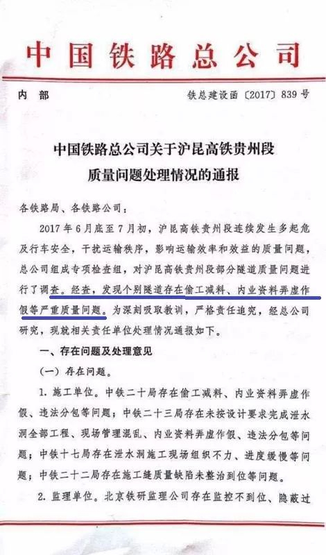 近日,中国铁路总公司内部人士证实了网友日前发布的一份通报。该《中国铁路总公司关于沪昆高铁贵州段质量问题处理情况的通报(铁总建设函2017]839号》(以下简称《通报》)称,通车不到一年的沪昆高铁个别隧道存在偷工减料等严重质量问题。