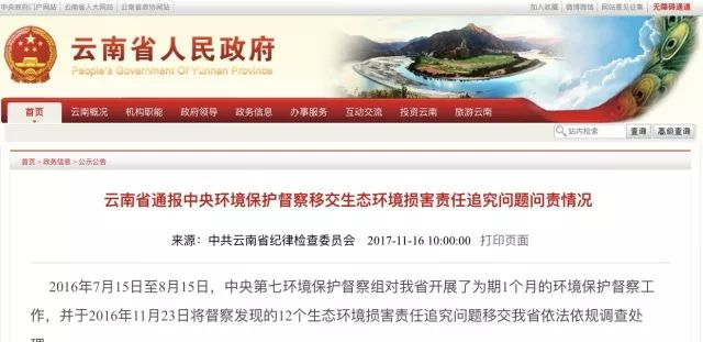 2016年7月15日至8月15日,中央第七环境保护督察组对我省开展了为期1个月的环境保护督察工作,同年11月23日将督察发现的12个生态环境损害责任追究问题移交云南省依法依规调查处理。