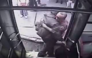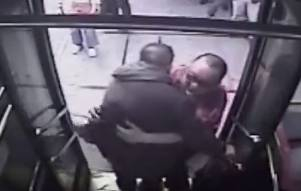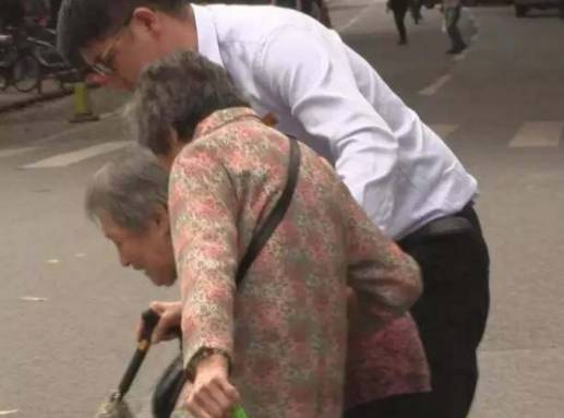 一辆正在等红绿灯的轿车里,突然下来一个穿着白衬衫、黑色西裤的年轻人,他小步跑到阿婆身后,拦腰把阿婆抱了起来。