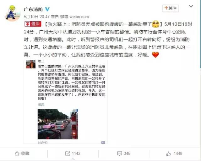 2016年5月10日晚上8时许,广东省公安消防总队@广东消防 发布一条微博,讲述广州消防天河中队执行任务时遇到的感人一幕。