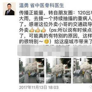 “我当时主要是想表达对小哥的谢意,所以就发了朋友圈了。在外卖小哥帮忙疏导交通的时候,两侧的车主也积极配合。当车子经过他旁边的时候,医生们摇下车窗,跟这位小哥说道谢。”