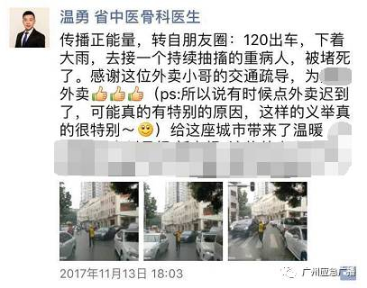 陈医生:当时我们接到120任务,在海珠中路有一位抽搐的患者,需要紧急紧急医疗救护。那时候雨中的大德路塞车比较严重,而我们的救护车选择从大德路逆行至海珠中路往海珠南路方向的最近路程。雨中的交通比较混乱,有一位送外卖小师傅就停下车,在我们救护车前,分流交通道路,正向开车的司机们也非常配合两边分流,使我们的救护车很快就穿过了塞车路段,我们也很快就到达现场了。