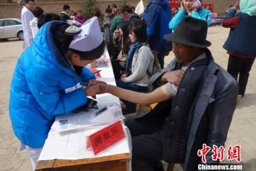 资料图:医疗志愿服务队对当地群众测量血压。 孙睿 摄
