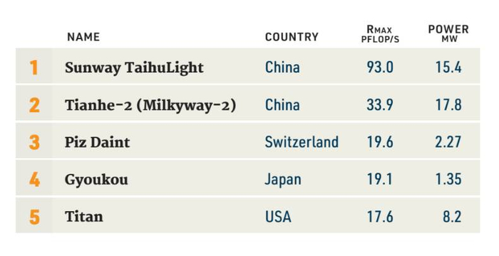 (超级计算机500强榜单前5名。第三名是来自瑞士的“代恩特峰”,第四名是日本的“晓光”。美国超算“泰坦”名列第五。)