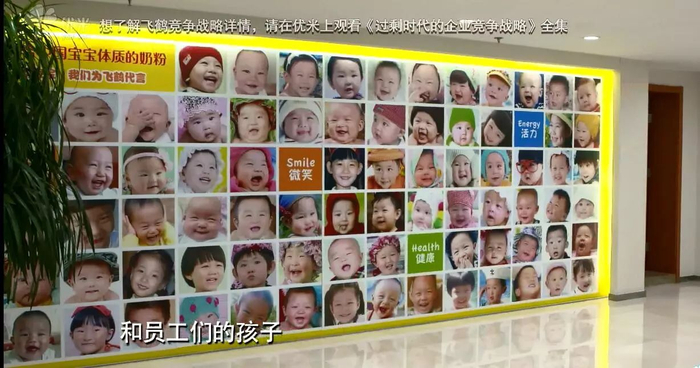 在飞鹤每一座办公楼和工厂厂房,最显眼的地方都有一面宝宝墙,墙上是飞鹤管理层和员工们的孩子,这些孩子都是从出生就吃飞鹤奶粉长大。
