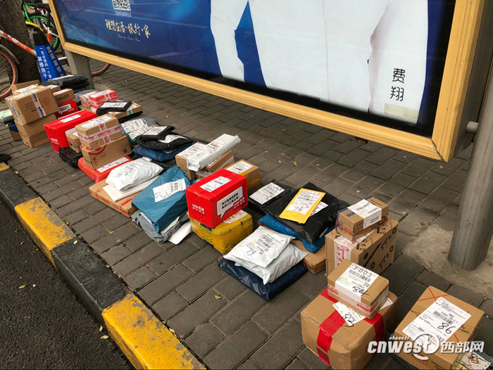 今天一大早,记者在西安市南郊某小区门口看到,四五家快递公司的电动车停在小区门口,快递员们着急地拨打着电话,通知买家来取包裹。
