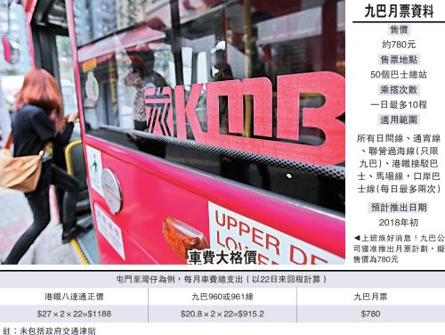 中新网11月16日电 据香港《大公报》报道,经常乘搭长途巴士的香港上班族有好消息,香港九巴公司获特区政府批准推出月票计划,最快明年初开售,售价780港元,一个月内每日十程任意搭乘所有九巴路线。为防被水货客滥用,月票特设限制,过境线每日只限两次。不少新界区居民欢迎推出月票,有立法会议员还促请八达通公司尽快更新系统,让乘客早日受惠。