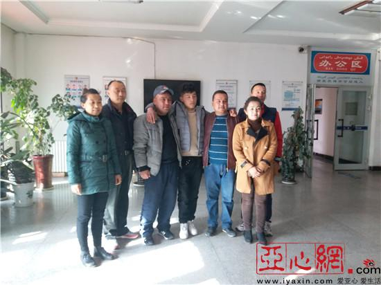 在库尔勒市公安局塔什店派出所大厅,林波(中)和养父(前右二)、养母及生母合影留念