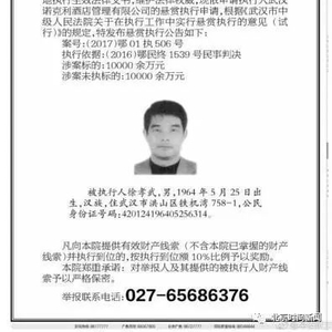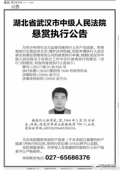 武汉悬赏找老赖 举报这个老赖可奖1000万元