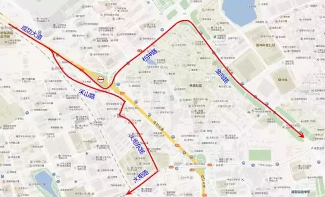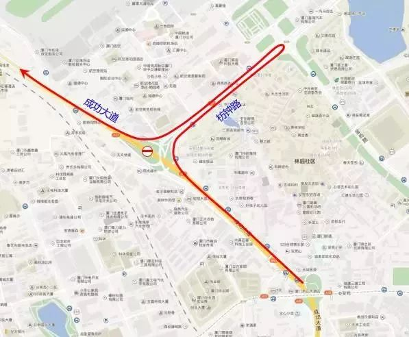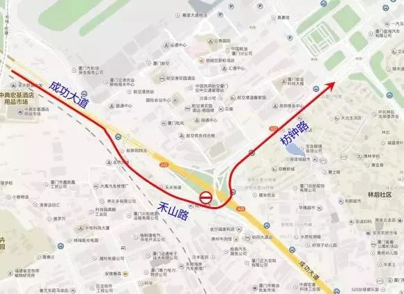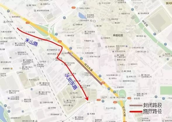 成功大道(枋湖北二路至枋钟路段)西侧禾山路辅道封闭施工期间,车辆通过火炬东路绕行。