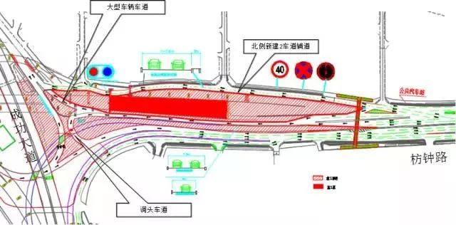 1、小型车辆通过枋钟路北侧新建2车道辅道通行,调头及大型车辆通过枋钟路北侧保留现状1车道通行