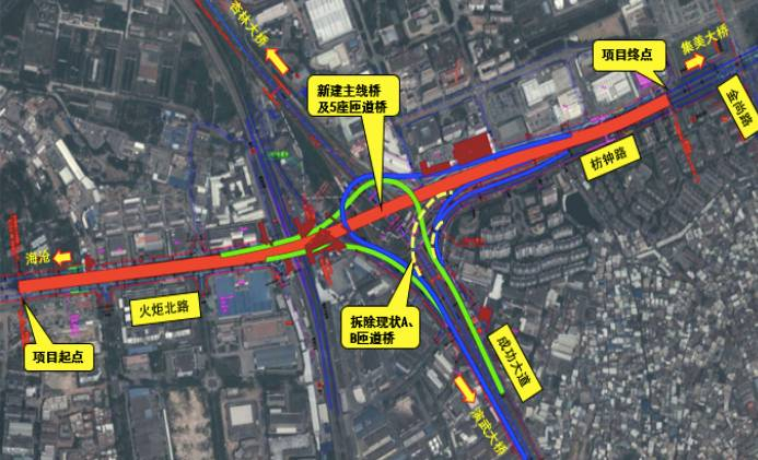 起于海沧隧道火炬北路洞口,以桥梁形式上跨鹰厦铁路和成功大道后,落地与枋钟路衔接,路线全长1.7公里,主要建设内容为现状成功大道机场立交的提升改造,包含新建一座主线桥、五座匝道桥,以及沿线道路改造、绿化等工程。