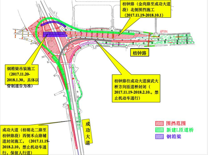 2017年11月20日至2018年1月30日,主线桥第6联左右幅、H匝道桥第4联钢箱梁吊装期间,成功大道主线双向、枋钟路出岛方向、成功大道左转枋钟路匝道夜间各临时封闭2~3晚(具体以管制通告为准)。