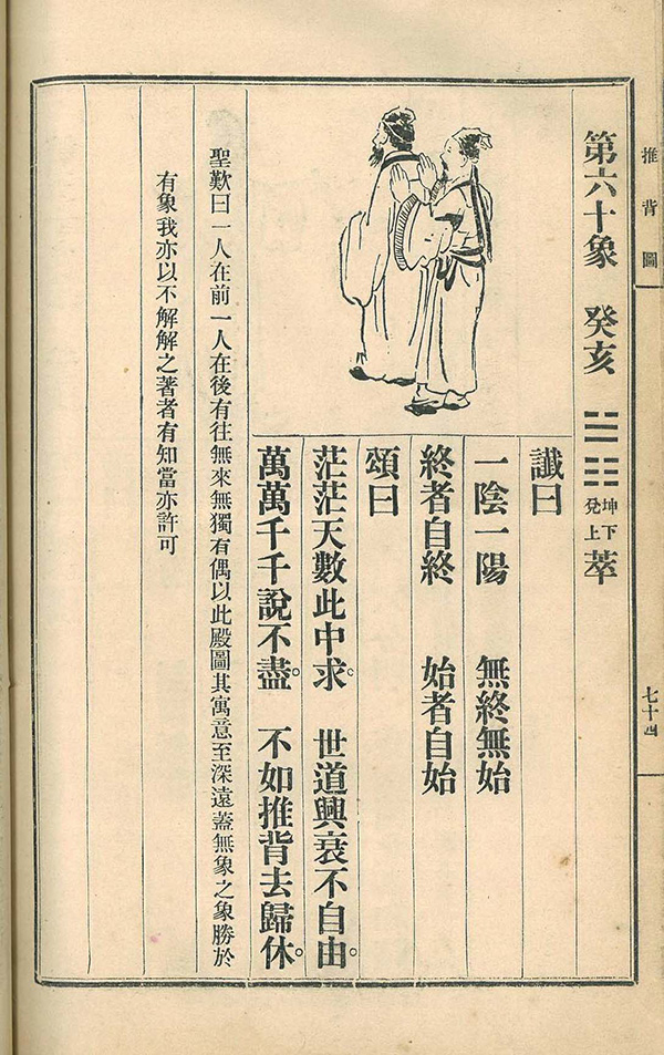 全书内容是两位预言大师对唐朝及其以后朝代重要事件的预测。推背图以《周易》64卦名称排列象序, 按天干地支相配,依甲子、乙丑之顺序循环一周, 故只60卦象。每一象是由“卦、图、谶、颂”四部分构成,预言后世兴旺治乱之事。如第3象画面上是一个女人手持大刀。图谶中的女人持刀,有习武的意思,暗含一个“武”字。日月当空为“曌”,是武则天的名。“照临下土”,照、曌同音,预言武则天将当皇帝。“扑朔迷离”为《木兰辞》的句子,将花木兰与武则天相比,暗示武则天虽是女儿身,却具有男性的才能。