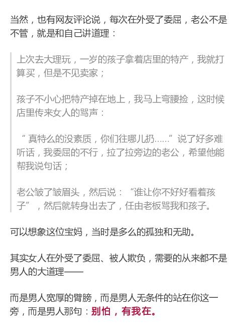 最后,希望所有男人在老婆受委屈、被欺负的时候,给的不是道理、指责,而是是支持、在乎和肩膀。