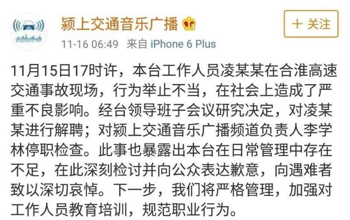 目前,安徽颍上广播电视台已决定解聘凌某某,频道负责人李学林停职检查。颍上交通音乐广播官微致歉称:“此事也暴露出本台在日常管理中存在不足,在此深刻检讨并向公众表达歉意,向遇难者致以深切哀悼。”