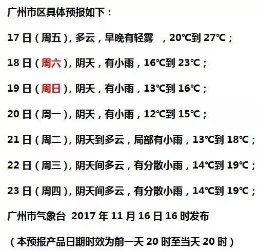 广州18日白天有小雨局部中雨,起风,气温大幅下降。过程日平均气温下降幅度:中北部8~10℃,南部6~8℃。过程最低气温将降至12℃左右(出现在20日早晨),北部山区可能降至10℃以下。