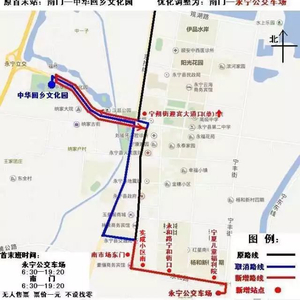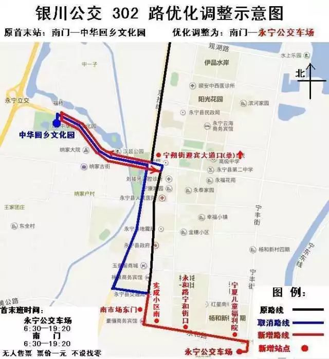 为有效利用公交场站,与永宁县城内公交线路衔接,方便市民换乘出行,公交302延伸调整为南门(始发)—胜利街—109国—迎宾大道(掉头)—迎宾大道—杨和街—永和路—永宁公交车场(终点)。新增南市场东门、实成小区南、永和路宁和街口、宁夏儿童福利院、永宁公交车场、宁朔街迎宾大道口(路东)6站。取消永宁高速路口、永宁县交通局、宁朔街团结路口、宁朔街胜利路口、宁朔街利民路口5站。