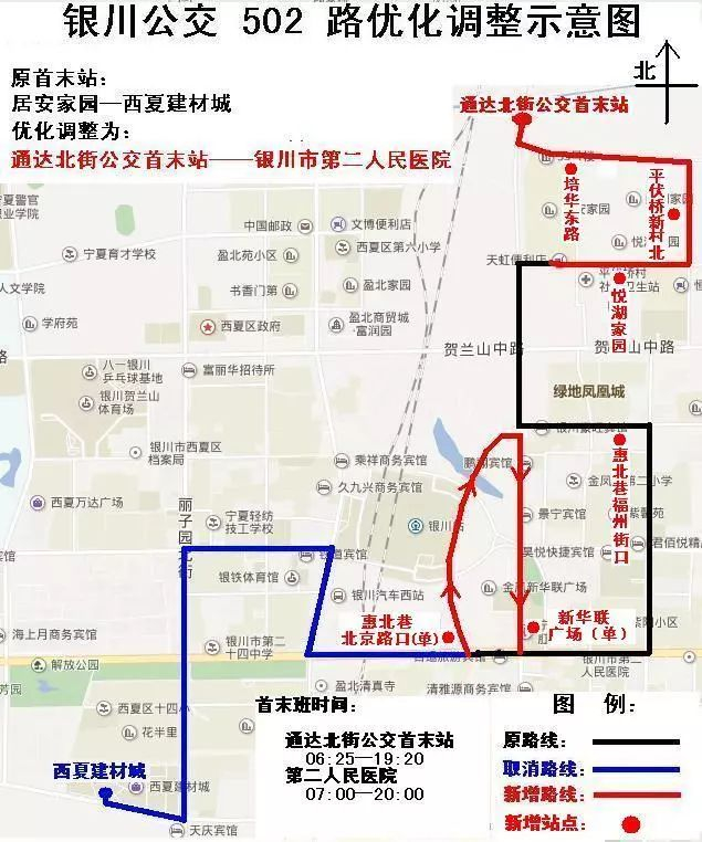 为有效利用公交场站,填补悦湖家园区域公交空白区,公交502延伸调整为通达北街公交首末站(始发)—培华路—平伏桥规划路—居安家园南巷—通达街—惠北巷—福州街—北京路—银川市第二人民医院(终点)。银川市第二人民医院(始发)—北京路—惠北巷—通达街—北京路—福州街—惠北巷—通达街—居安家园南巷—平伏桥规划路—培华路—通达街公交首末站(终点)。
