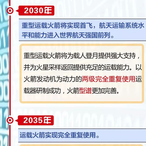 根据航天运输系统路线图:到2020年,我国主流火箭达到国际一流水平,面向全球提供多样化的商业发射服务。到2025年前后,我国可重复使用的亚轨道运载器研制成功,亚轨道太空旅游成为现实。亚轨道一般是指距离地面20-100公里的空域,处于现有飞机的最高飞行高度和卫星的最低轨道高度之间。到2030年左右,重型运载火箭实现首飞,航天运输系统水平和能力进入世界航天强国行列。到2035年左右,运载火箭实现完全重复使用。到2040年左右,未来一代运载火箭投入应用,空间运输系统实现长时间多次星际往返。到2045年,我国具备规模性人机协同探索空间的能力,装备和技术总体处于国际领先,有力支撑航天强国目标的全面实现。
