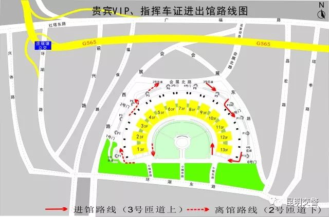 1.持组委会加贴开馆仪式特殊标识的贵宾VIP车证车辆及指挥车证车辆到达滇池国际会展中心现场后,由会展北路,经3号匝道进入三层外环道路,车辆沿三层外环道路顺时针行至三层内环道路,沿三层内环道路逆时针行至贵宾厅门前停车下人,空车停放于三层平台指定位置顺序停放,离场时由2号匝道、会展北路驶离。