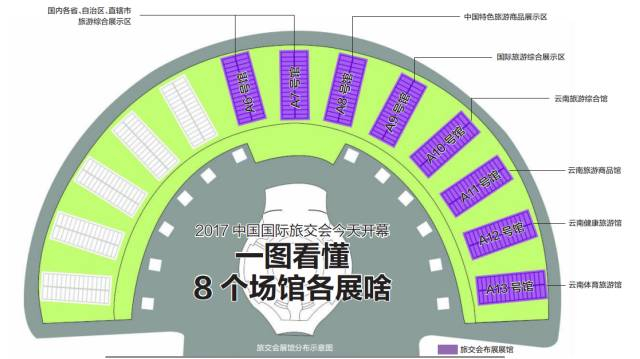 本届旅交会共设8个展馆,并首次设立体育旅游馆。云南参展团规模最大,有351个展位。包括特装展位117个,标准展位234个,展览总面积达17200平方米。
