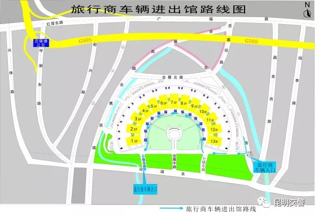 3.持组委会旅行商车证车辆到达滇池国际会展中心现场后,经会展东路—会展中心6号口—会展南路—场馆内环道路(逆时针方向)靠环线内侧顺序停放—离场时,经会展南路由小镇西路驶离场馆。当内环道路酒店大巴车辆停放饱和时,指挥后来大巴车辆下客后至会展南路两侧有序停放。