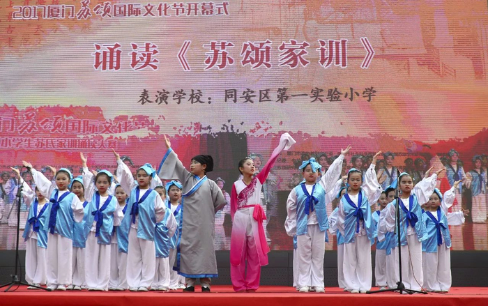 在刚刚结束的苏氏家训诵读大赛中,15所小学积极参与诵读简编的白话文普及版本《苏氏家训》并通过网络展示,在3天时间内共吸引了近160万次点击、近28万次投票。综合现场评分与网络投票情况,最终评选出1名最佳人气奖、1名最佳表演奖、3名三等奖、2名二等奖和1名一等奖,现场给予颁奖。