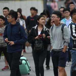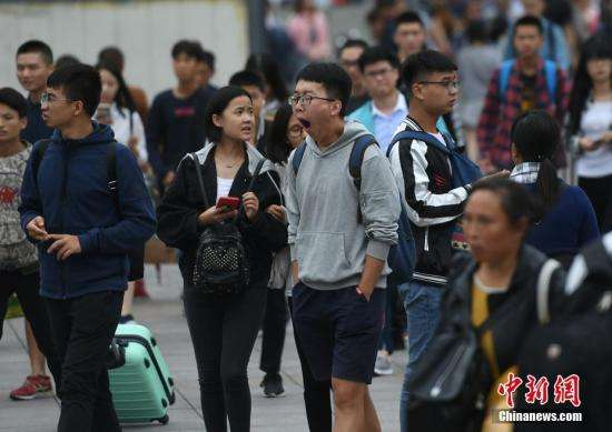 ↑图为出行旅客在人群中打哈欠。 中新社记者 陈超 摄