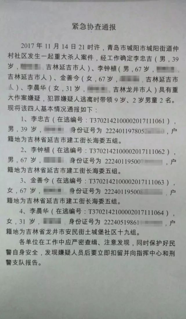 11月16日晚,城阳公安发布通告称,11月15日城阳警方接报警,城阳区发生一起命案,仲村某小区一家四口被杀害。警方经过缜密侦查、连续奋战,于16 日18时许,在北京昌平警方配合下,将犯罪嫌疑人李某吉、李某植、金某今、李某华(均为吉林籍)全部抓获。案件正在办理中。