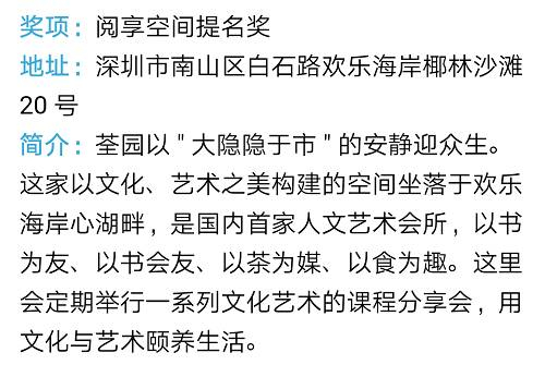 深大简阅书吧、我们书房之乡村书房、荃园、时间行者书店、潘燕生(中国建筑书店深圳连锁店)、赖佛花(麦哲伦书吧)分获提名奖。