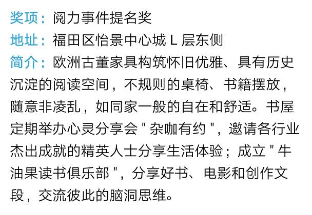 简介:这是深圳市首家集全民阅读中心、社区图书馆、" 四点半学校 "、文化活动中心和简约书吧为一体的公共文化服务平台。占地 630 平方米,具备阅读、借还书、购书、休闲、展示等功能。这家书店一直秉承着 " 书店不仅仅只有书 " 的理念运营至今,经常被称为 " 缩小版书城 "。书吧成立的 " 四点半学校 " 公益项目,为放学后无人照看的孩子提供学习场所,并且有老师专门指导学习。有效解决了父母下班晚无法辅导孩子的实际问题。
