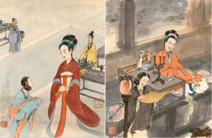 在傅抱石的人物画创作中,郭沫若起了相当的引道作用。在东京留学期间,道师金原省吾就介绍傅抱石与同时期在日的郭沫若认识,从此二人结下终生友谊。1942年,郭沫若创作出五幕历史剧《屈原》,在战时力图表现屈原的爱国主义情怀。受此影响,在《屈原》公演后,傅抱石即创作出第一幅《屈原像》,之后同题材作品更是不断出现(图5)。见证傅郭二人艺文交往的例证在新中国成立以后更多,代表性的例证就是《武则天》的创作。虽新中国成立以后傅抱石已不再频繁创作人物画,但当郭沫若1959年写成著名的《武则天.四幕史剧》后,傅抱石隔年即创作出相应和的作品(图6),尤以武则天和上官婉儿之微妙神态令人叫绝,由此可见二人交往之深切。《琵琶行》的创作初衷是否有郭沫若发挥作用已无从考证,但眾所周知,郭沫若亦有以《琵琶行》为主题的改编诗,暂可推定二人就琵琶行的创作应当有所互动:「江州司马湿青衫,一曲琵琶驻客帆。马亦低头蜷复顾,中天唯见月光寒。」