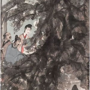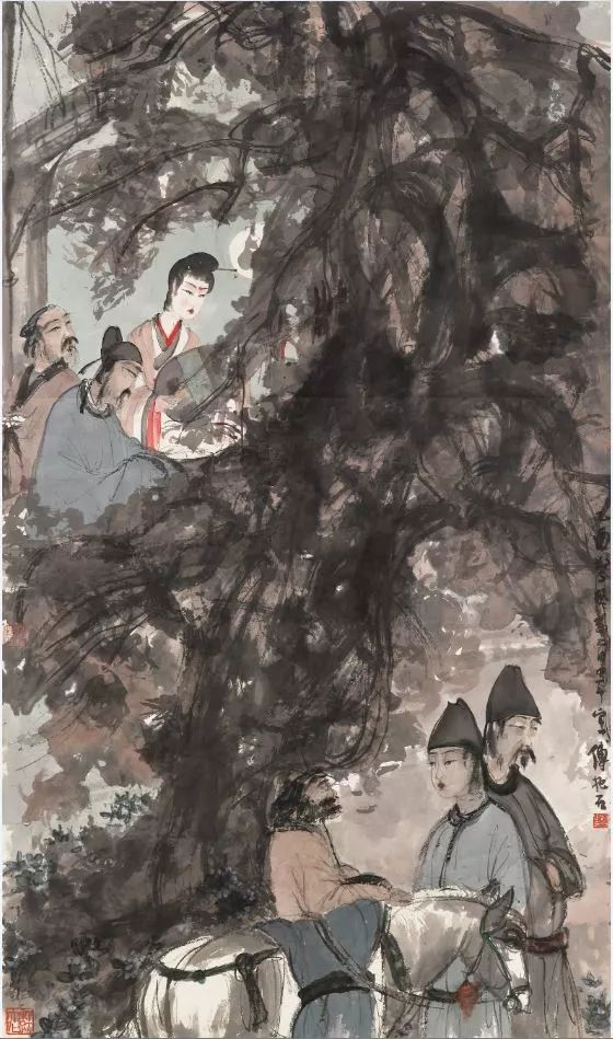 《琵琶行》创作于1945年,是傅抱石人物画、诗意画全省时期的杰出代表作。其创作题材来源于中唐诗人白居易脍炙人口的名篇《琵琶行》。画中傅抱石营造对角呼应的缜密构图,以精妙的笔法和对光影的巧妙运用,将造型和色调完美融合。画中枫树枝繁叶茂,笔触恣意豪迈;人物神情丰富,刻画入木三分,画家尽将「同是天涯沦落人」的哀愁情绪表现的淋漓尽致,宛如寒夜中传来的人间可哀之曲,由此创作出一种既纵横挥泪、无所拘束,又鲜艳精工、高古典雅的人物画新面貌。此作由孔祥熙家族珍藏六十余载秘不示人,甫一面世,震动艺坛,可比肩博物馆中所藏最精者,实为傅抱石人物画创作的巅峰之作。