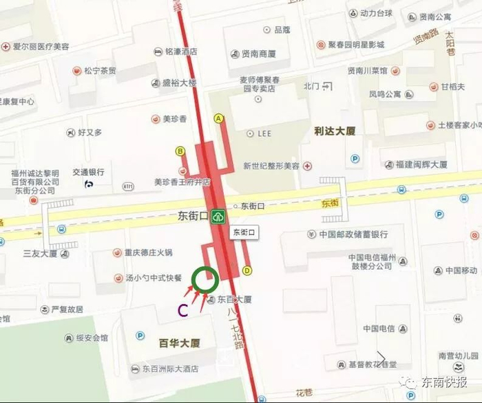 C站开放后,以后市民来这附近逛街,就更方便了,注意东街口4个出入口的具体方位哦: