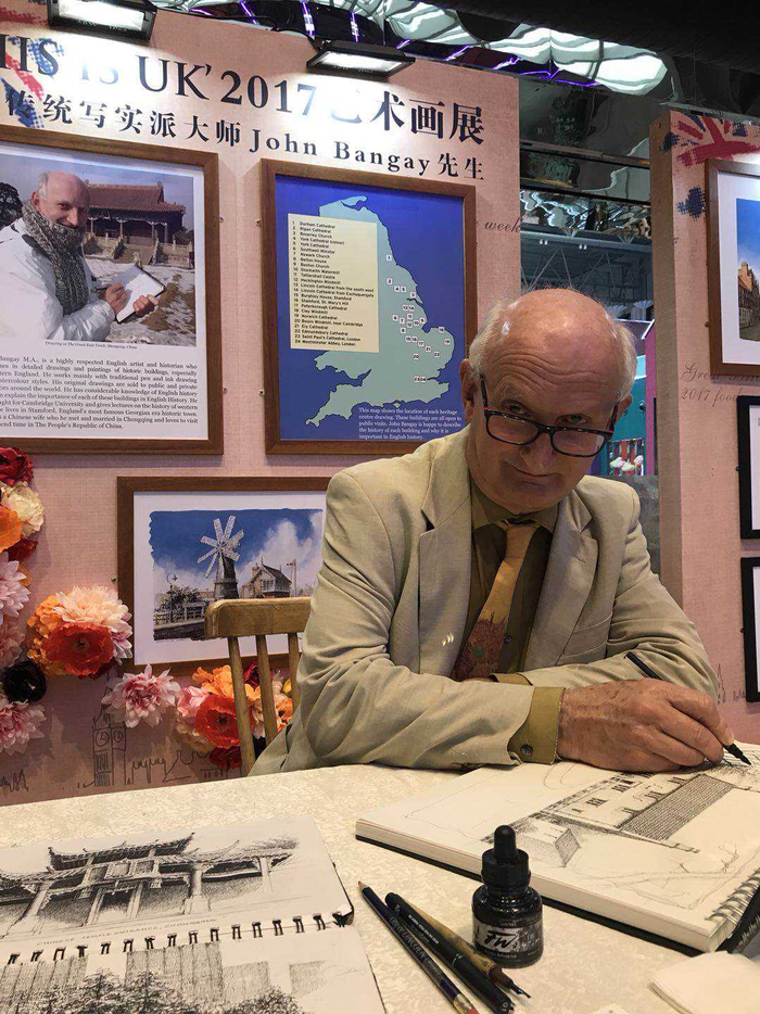 在iChongqing重庆与世界嘉年华活动现场,一位老人正在专心致志地画着素描。画中,解放碑的雏形若隐若现,吸引着众人的目光。原来这位老人是受邀从英国远道而来的69岁画家约翰•邦盖(John Bangay)。不仅如此,他还是英国著名的历史学家,目前在剑桥大学教授西方艺术史。