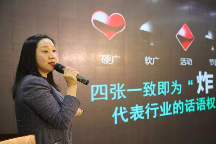 宋主任推陈出新,用出扑克牌的方式介绍了2018年度电视平台的招商理念及产品。她认为,广告赢的就是创意,没有快乐如何创意!带着客户一起“欢乐斗地主”,让在场客户清晰的了解到,与龙广电合作,会拿到什么样的牌。