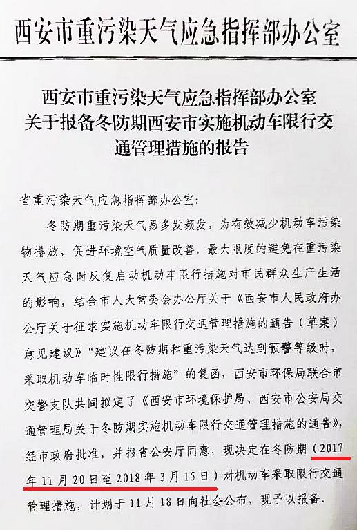 同时,网络上还出现了《西安市重污染天气应急指挥办公室关于报备冬防期西安市实施机动车限行交通管理措施的报告》,内容显示报告对象为陕西省重污染天气应急指挥办公室。文件显示,由西安市环境保护局联合西安市公安局交警支队共同拟定限行措施通告,并且经西安市政府批准,报陕西省公安厅同意,计划11月18日向社会公布。