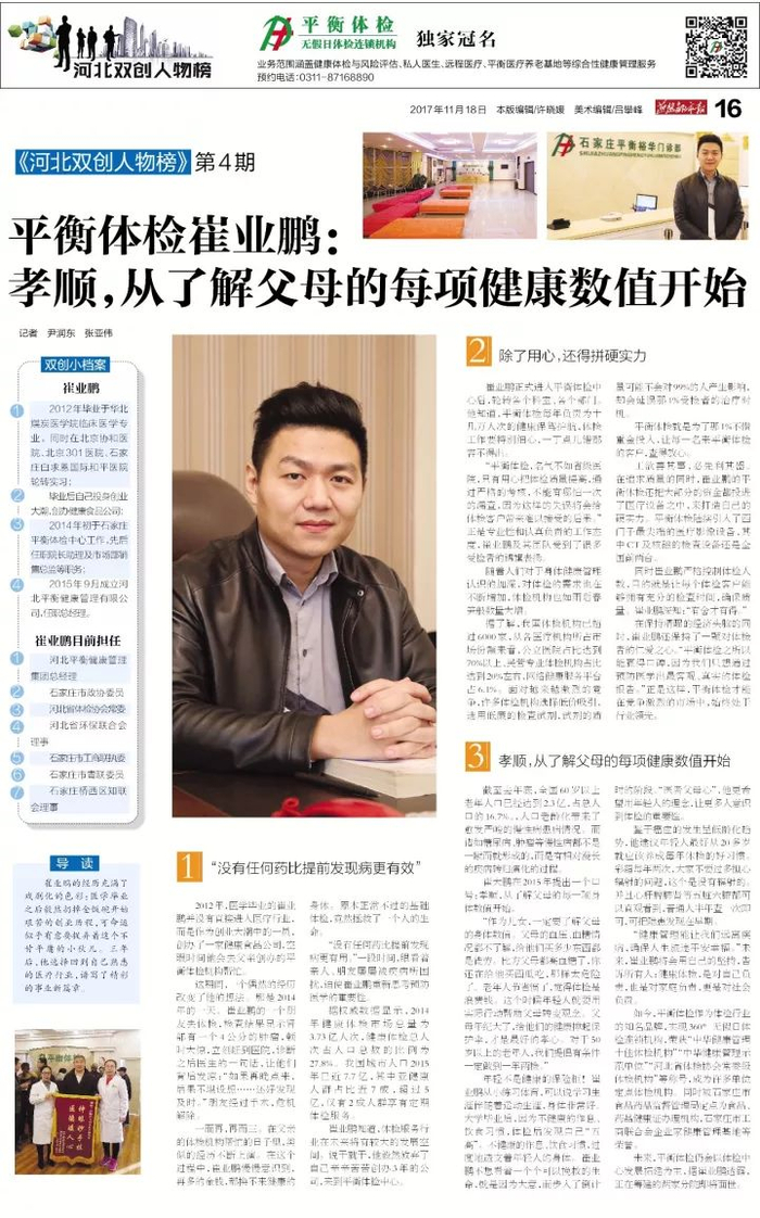 在保持清醒的经济头脑的同时,崔业鹏还保持了一颗对体检者的仁爱之心。“平衡体检之所以能赢得口碑,因为我们只想通过预防医学出最客观、真实的体检报告。”正是这样,平衡体检才能在竞争激烈的市场中,始终处于行业领先。