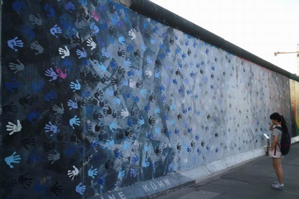 左边这张画表现的是柏林和纽约等城市联结在一起,右边则是万人触摸墙留下的手印形成的画面。