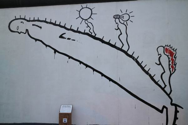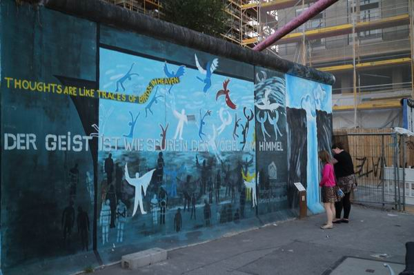 这幅画是《精神如鸟儿在空中的足迹》,人的思维完全不可能被囚禁,即便柏林墙挡住了人的肉体,但是思想会自由翱翔。
